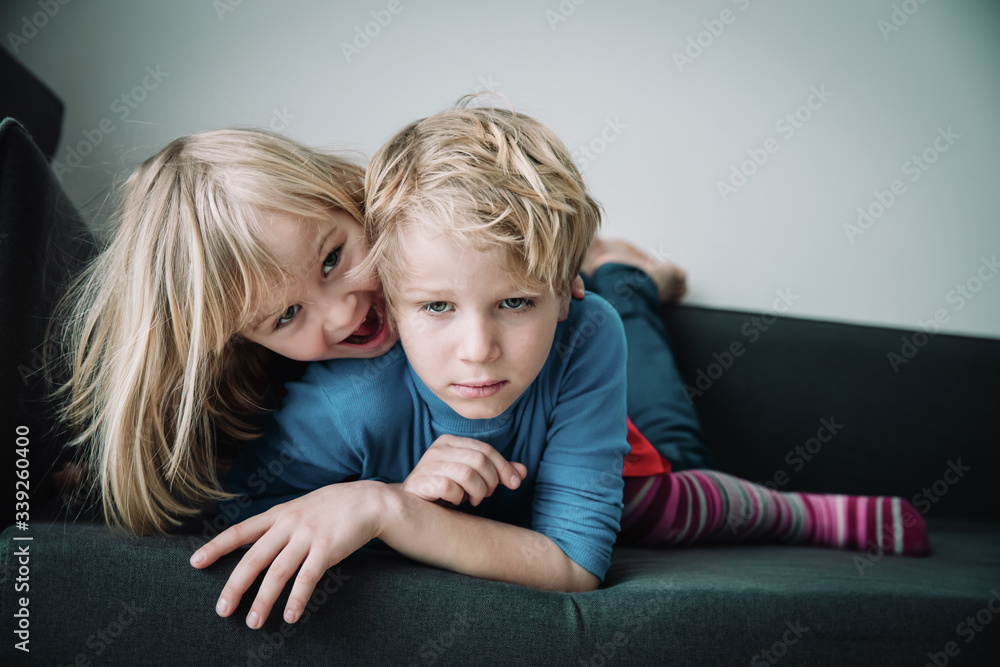 boy and girl staying home, family on qurantine, sister shouting on brother's ear