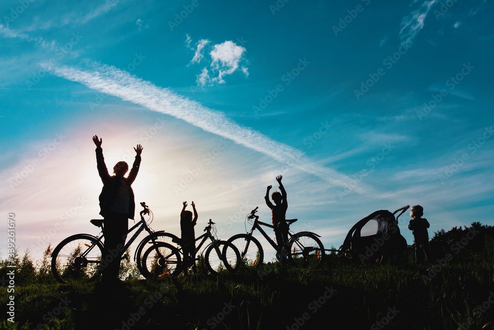 Happy family on bikes at sunset nature, dad and kids exercise in nature