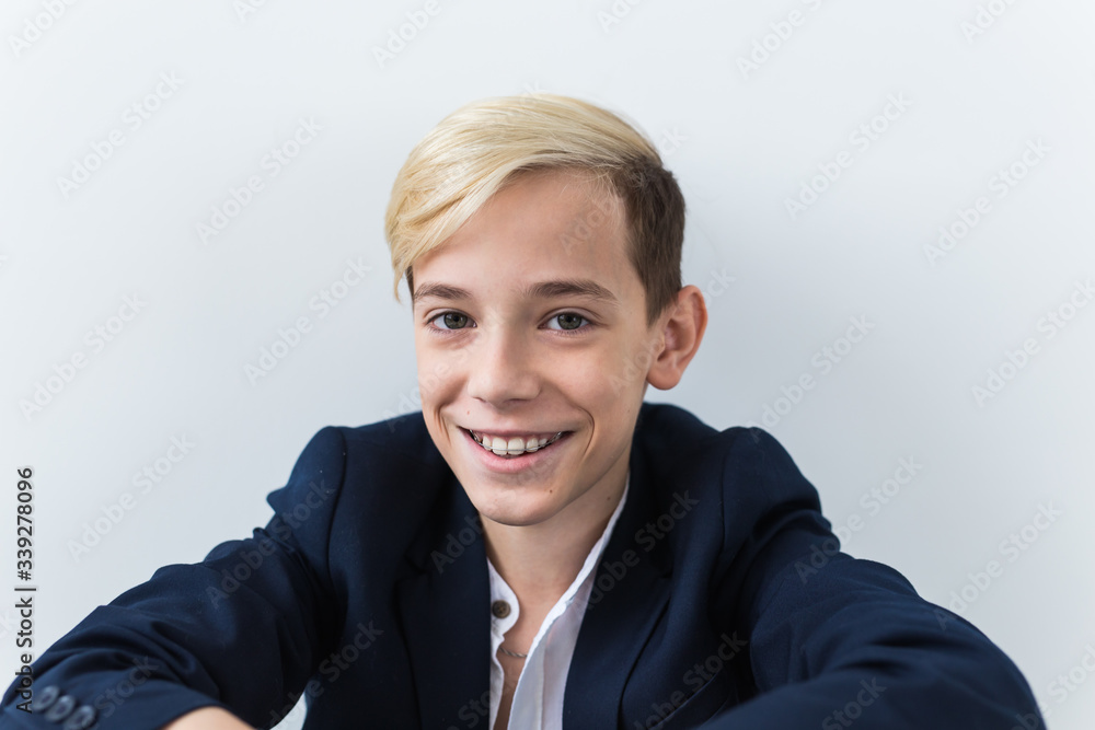 Attractive eleven year old boy with braces on his teeth. Dentistry and teenager concept.