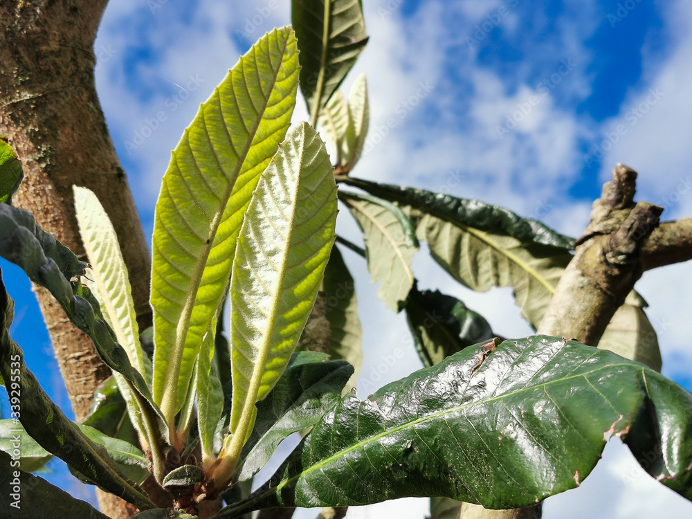Young leaves of the loquat tree ( Eriobotrya japonica ) early in spring. This species of orange plum is found in Japan, Korea, Pakistan, Philippines and is rich in vitamins, minerals and anti oxidant.