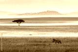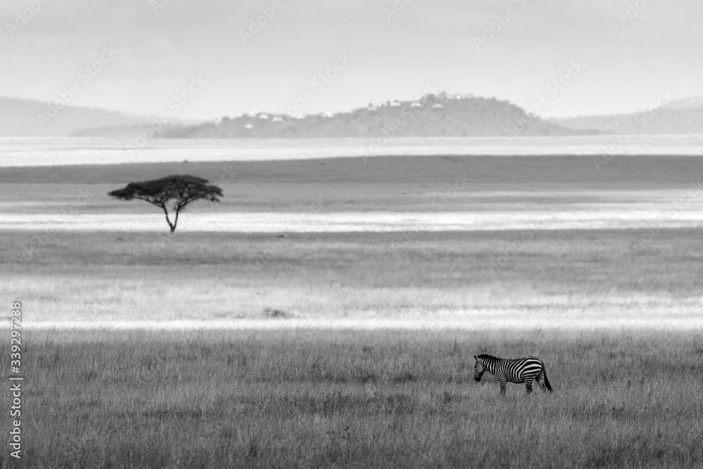 Single zebra on a field with single tree in background in Serengeti National Park in Tanzania during safari. Blak and white picture.