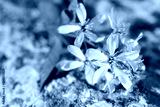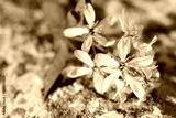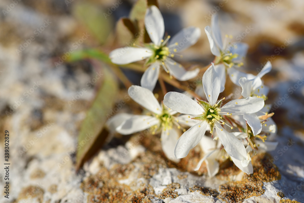 Delicate white small flowers lie on a light stone, outdoors in nature, as a background