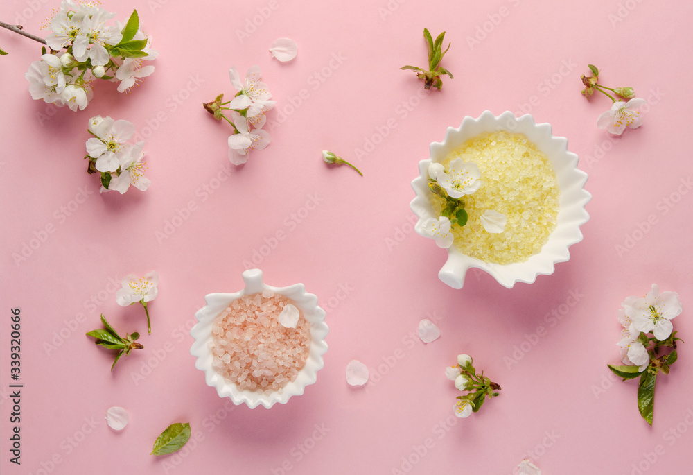 Yellow bath salt crystals in porcelain plate and cherry spring flowers with leaves on pink paper background for Spa or personal care