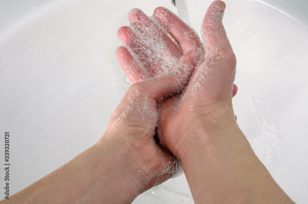 Cleaning hands from dirt, bacteria and viruses with tap water in the bathroom to protect against flu and illness