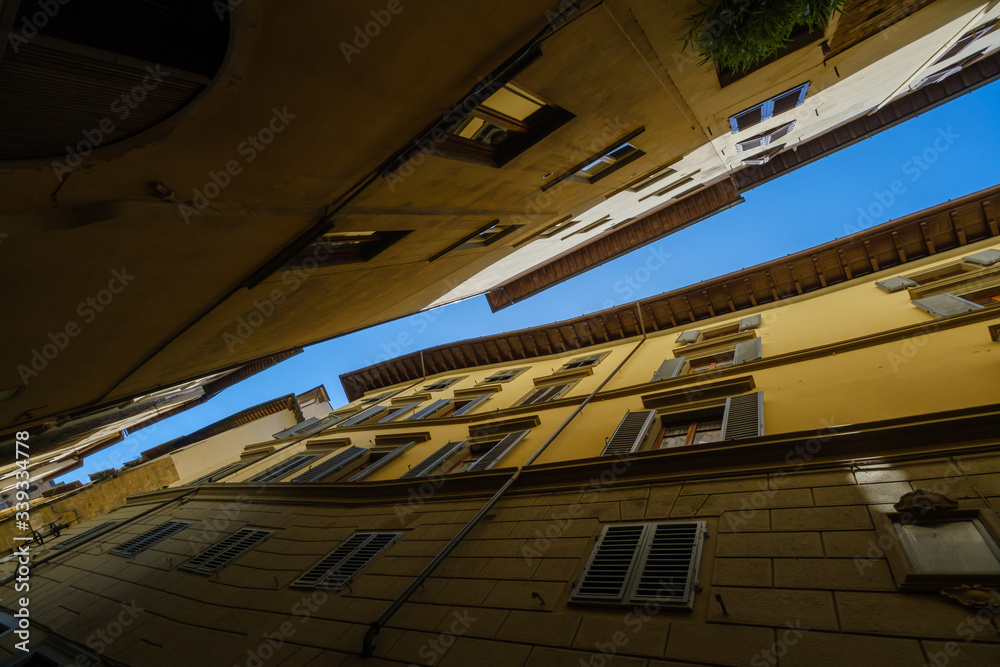 Narrow street view from the bottom up to the sky