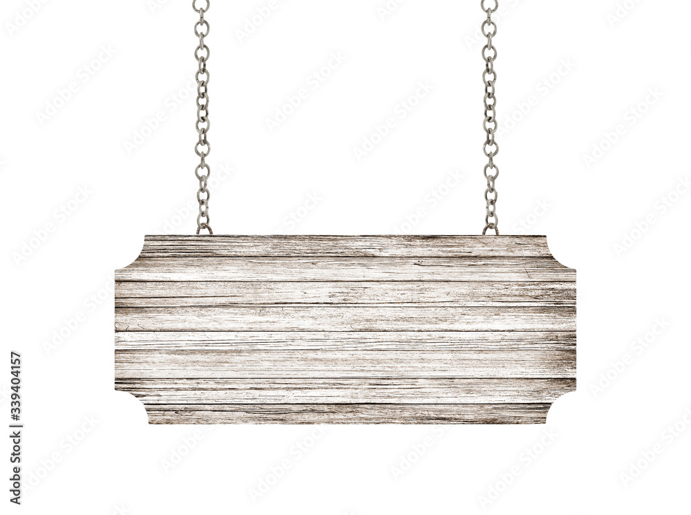 blank wooden sign hanging on a chain. isolated on white with clipping path