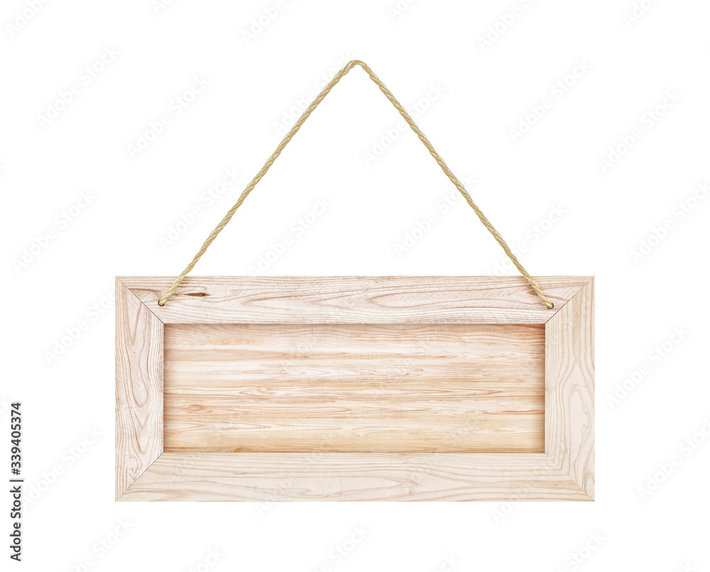 empty wooden sign with lope for hang on white background