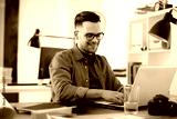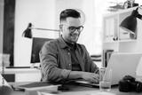 Young handsome man working in office. Bussinesman working on lap top in office.