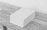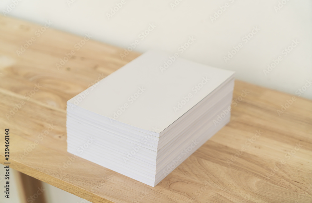 Blank catalog, magazines, book on wood background.