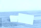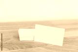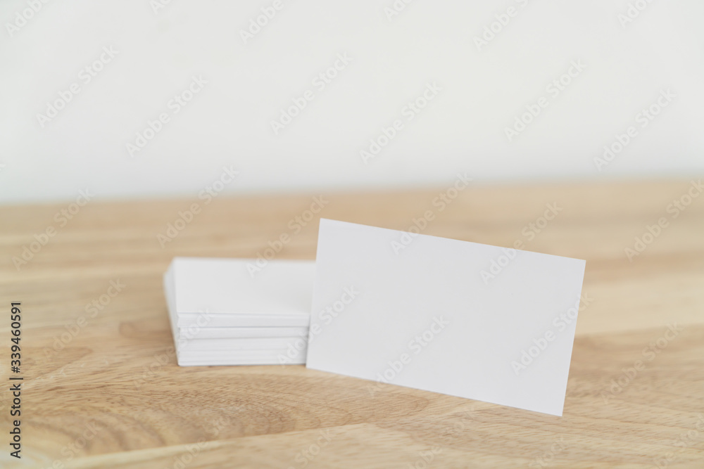 Blank business cards on wooden surface.