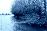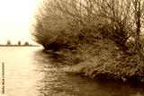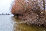 Beautiful view of tree branches over the river. Brown water in autumn season on river. Fisherman place with good nibble
