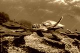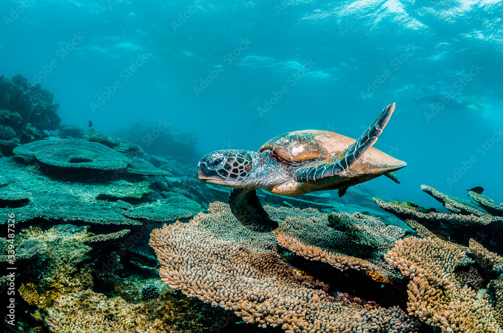 Green sea turtle swimming among colorful coral reef in beautiful clear water