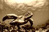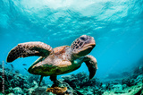 Green sea turtle swimming among colorful coral reef in beautiful clear water