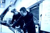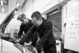Two Male Students Studying For Auto Mechanic Apprenticeship At College Working On Car Engine