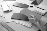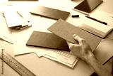 The interior designer selects ceramic stoneware and marble samples. Designer at work. Interior design. Architecture. Decoration. Design project blueprints. Grey marble. Grey stone. Decorative material
