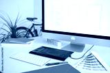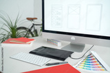 Web designer at work. Graphic designer. Mobile application design. Designer desktop. UX, UI design. Thumbnails of a mobile application on a computer screen. Gadgets, sketchbook and phone on the table