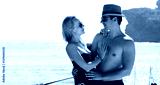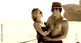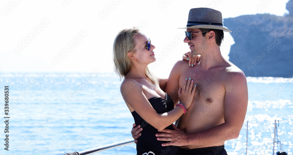 Happy couple in love in Santorini island, Greece. Summer Honeymoon on the beach.
