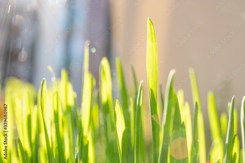 Close up on top of grass leaves in spring used as cat food or to show growth in economy. Bright sun light. Open for editing with copy space