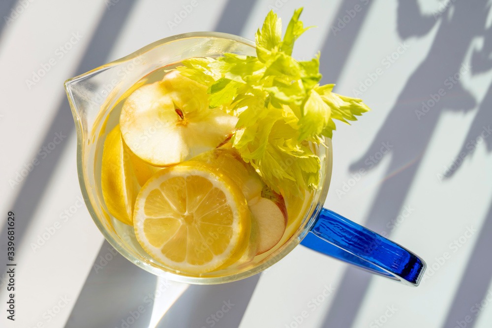 A blue handle glass carafe with high PH level alkaline water to increase immune system to fight corona virus. Ingredients: lemon and apple slices and a celery stalk on isolated white with shades.