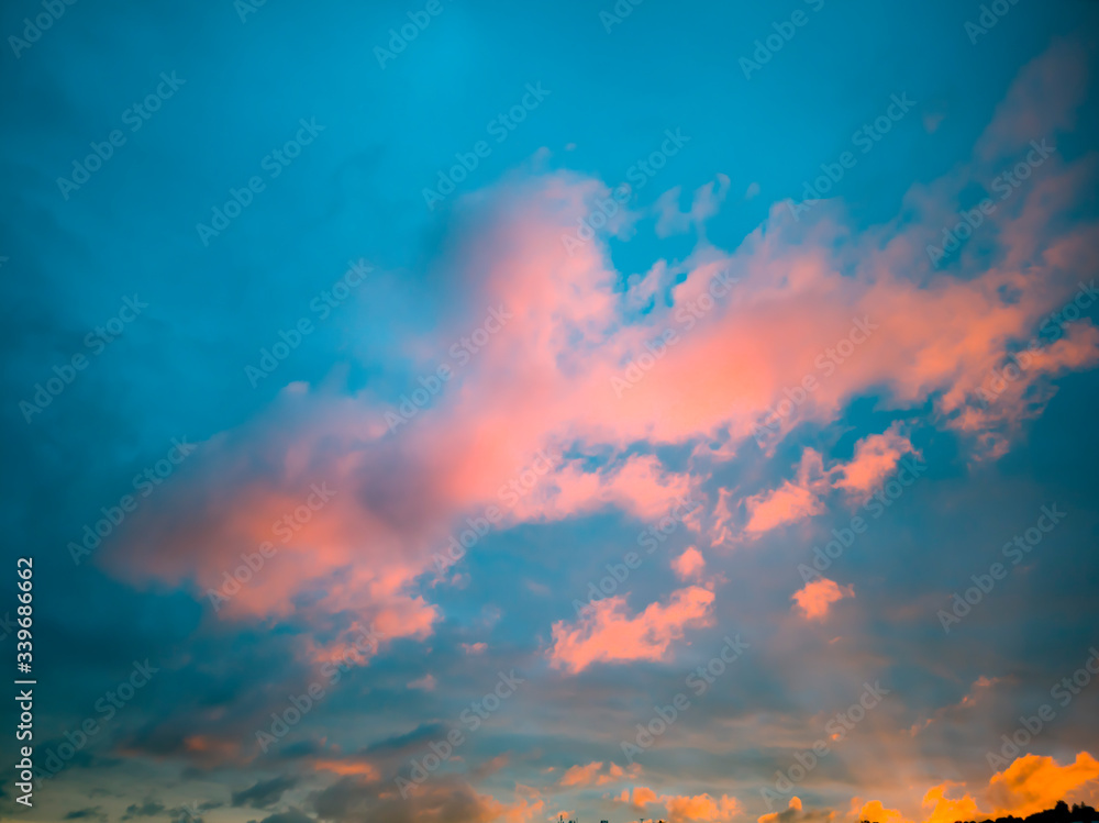Beautiful sky background at sunset with pink, yellow, purple clouds on blue sky. Easy for text writing with copy space
