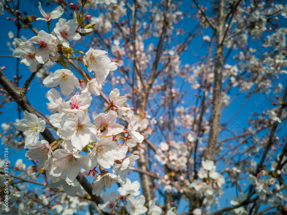 Close up on a branch of white and pink spring flowers on a tree with a bee