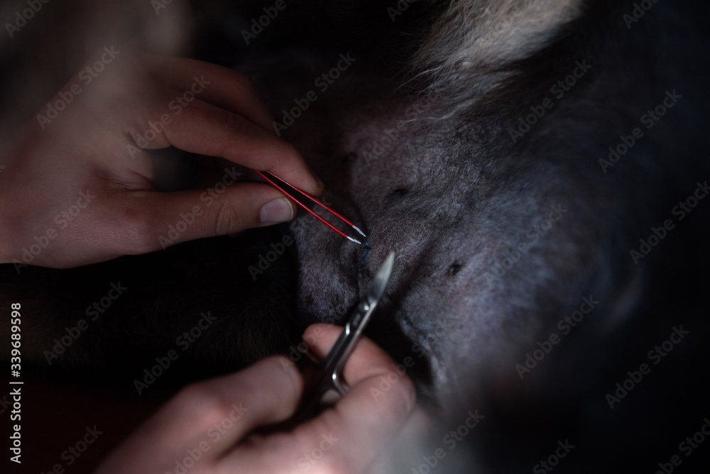 Tierarzt beim Fädenziehen einer Naht am Hund