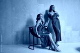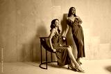 Two fashion model brunette hair wear silk dress sandals high heels accessory clothes date party walk interior furniture journey summer collection plant flowerpot wall stairs beautiful woman friends.