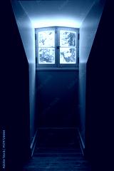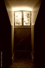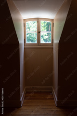 Interior view of a dormer window and very narrow opening in a darkened room, vertical aspect