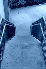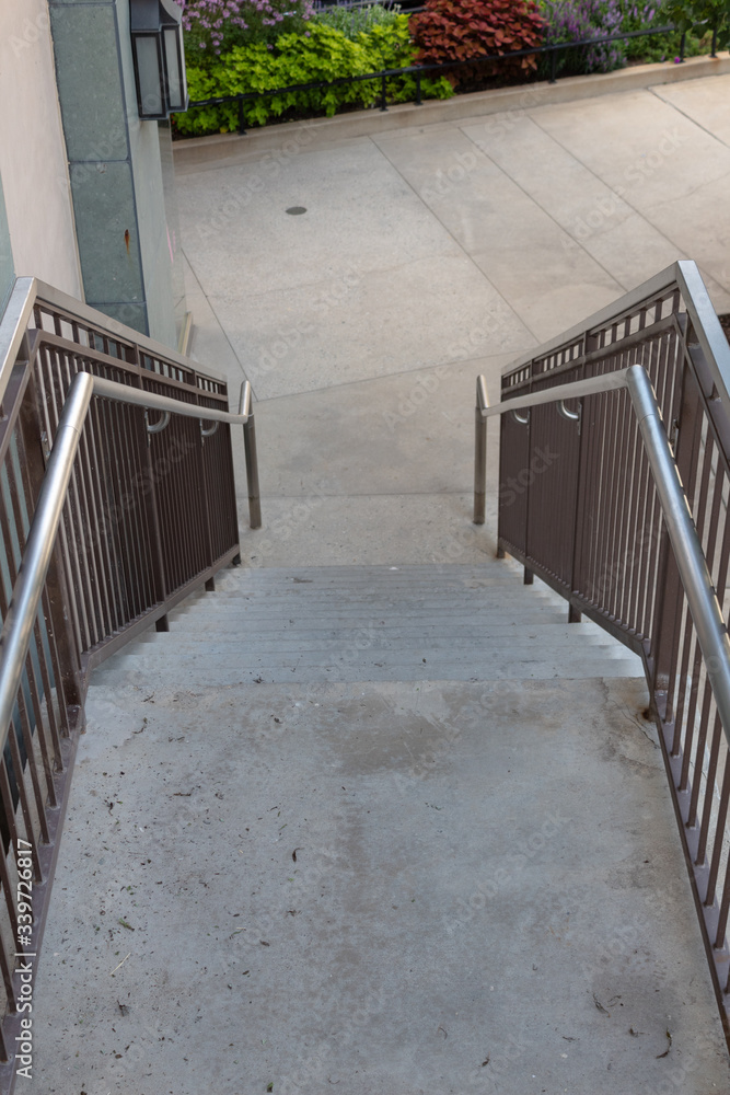 View looking down a narrow flight of concrete stairs with stainless steel railings, vertical aspect