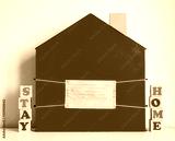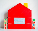 Red house with a message and a medical mask. Concept social distance, distance learning, home education, coronavirus, quarantine.