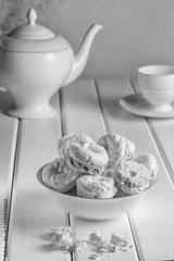 Sweet cakes in a bowl on foreground and a teapot and a tea cup on bokeh background.