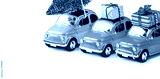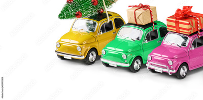 Retro toy cars no name carrying christmas tree and gift on roof isolated on white background. Christmas background. Holidays card. Copy space.