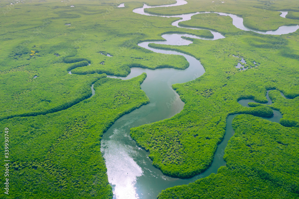 Aerial view of Amazon rainforest in Brazil, South America. Green forest. Bird's-eye view.