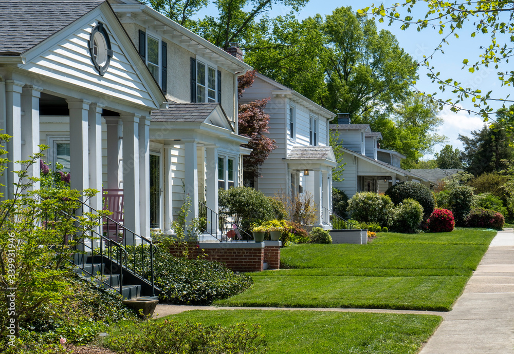 Older established urban residential neighborhood in spring.