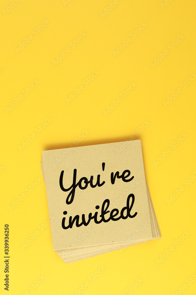 Paper sheet with text "you're invited" on yellow background