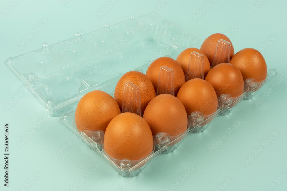 Eggs in a plastic package with isolated turquoise background.