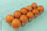 Eggs in a plastic package with isolated turquoise background.