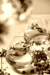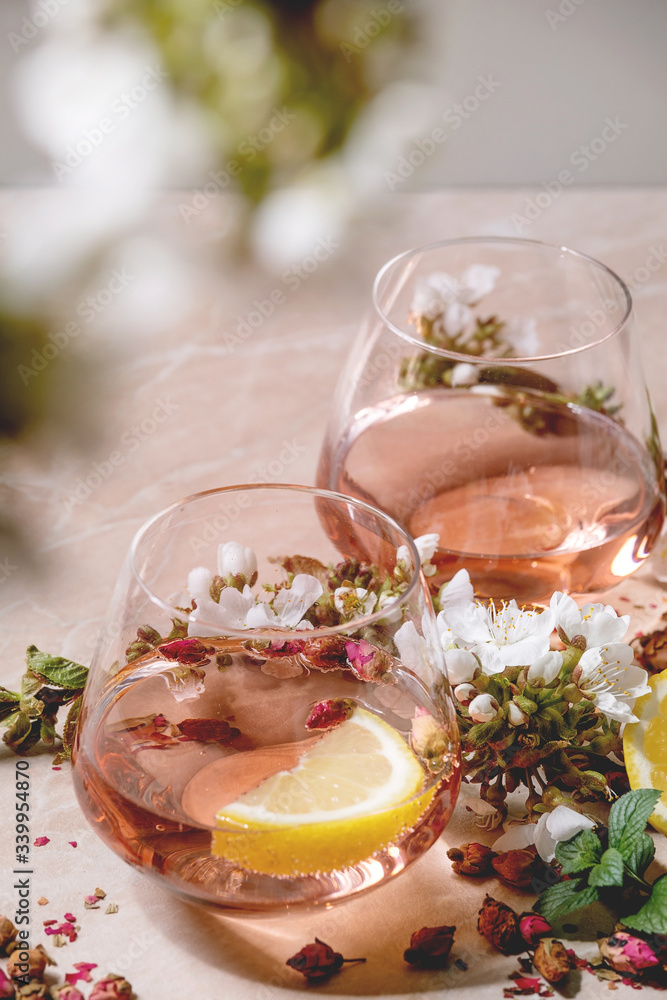 Cocktail glasses of pink rose champagne, cider or lemonade with dry rose buds, lemon and mint. Blossom cherry branches above. Pink marble background.