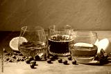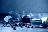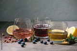 Different cocktail glasses with sparkling colorful drinks pink rose champagne, cider or lemonade with dry rose buds, lemon, blueberries and mint. Ingredients above. Gray texture background.
