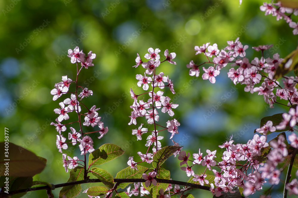 Prunus padus colorata pink flowering cultivar of bird cherry hackberry tree, hagberry mayday tree in bloom in sunlight