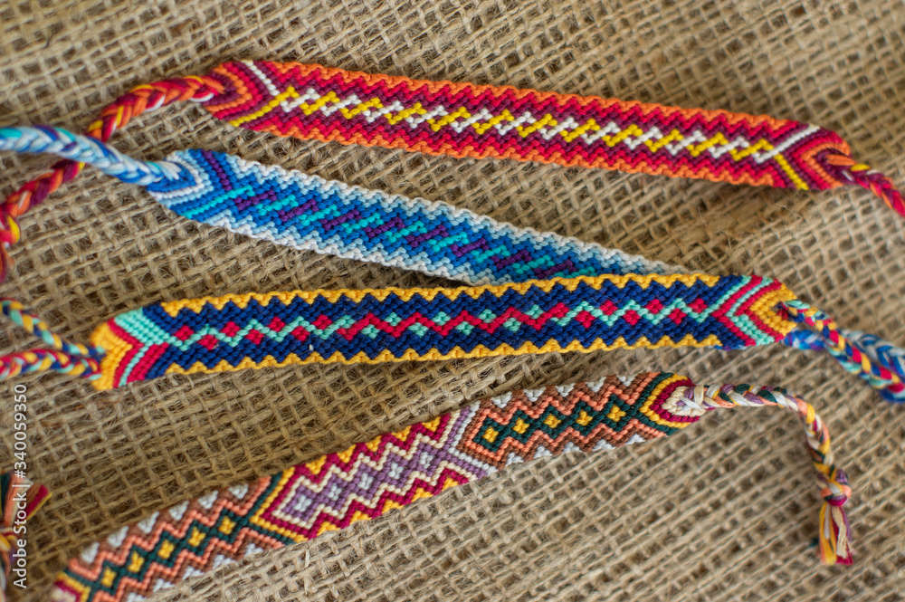 Group of handmade homemade colorful natural woven bracelets of friendship isolated on jute background