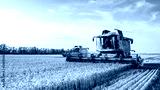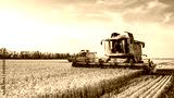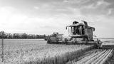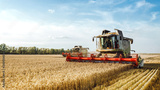 Combine harvester harvests ripe wheat. Ripe ears of gold field on the sunset cloudy orange sky background. . Concept of a rich harvest. Agriculture image