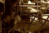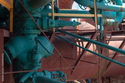 Colorful red and aqua tubes, pipes, and valves in an industrial complex, horizontal aspect