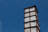 Sloss Furnaces National Historic Landmark, Birmingham Alabama USA, wood and steel tower against a deep blue sky, horizontal aspect