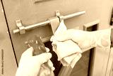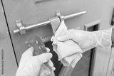 Closeup Of Hand Wearing Protective Gloves cleaning and disinfecting / sanitizing door handles during coronavirus epidemic. Prevention of COVID-19 infection. Stop coronavirus from spreading.