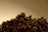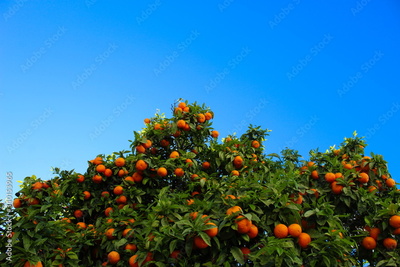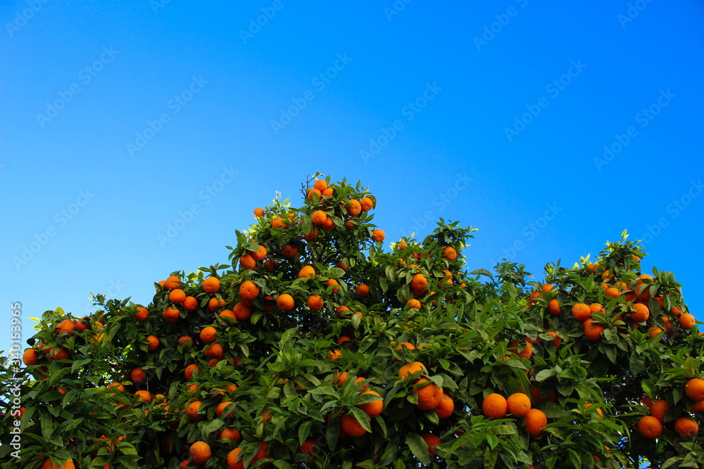 Ripe orange fruits on a tree with the sky in the background