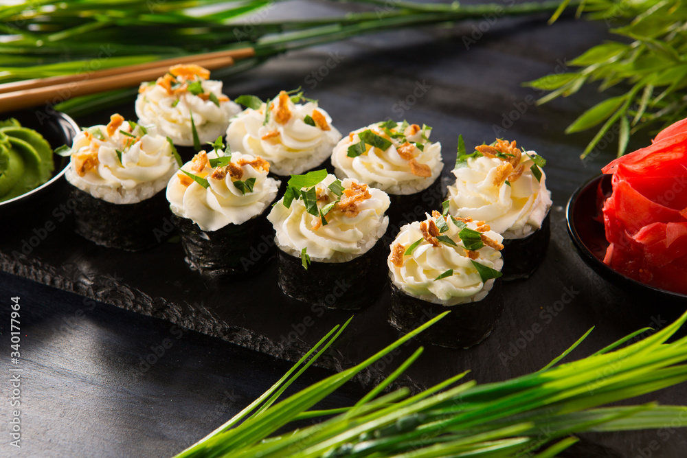 Set of sushi rolls with wasabi and ginger on a black background. Japanese oriental cuisine