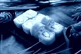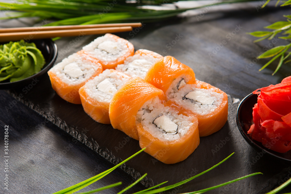 Set of sushi rolls with wasabi and ginger on a black background. Japanese oriental cuisine