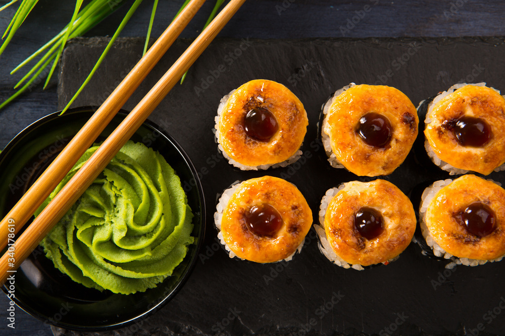 Set of baked sushi rolls with wasabi and ginger on a black background. Japanese oriental cuisine