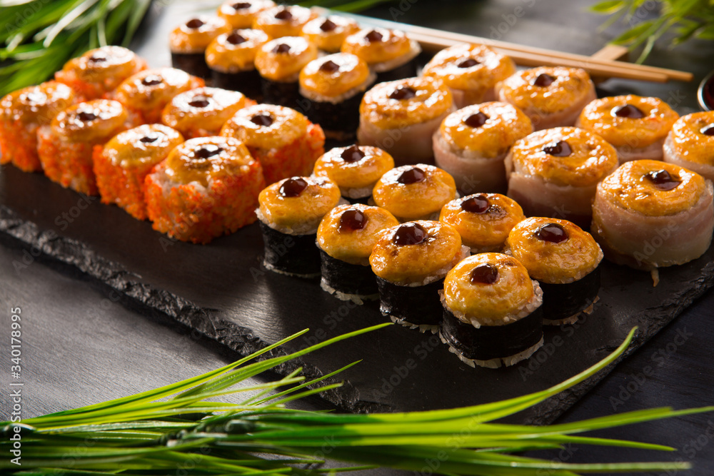 Set of baked sushi rolls with wasabi and ginger on a black background. Japanese oriental cuisine